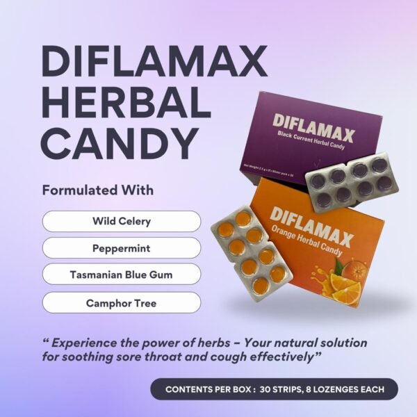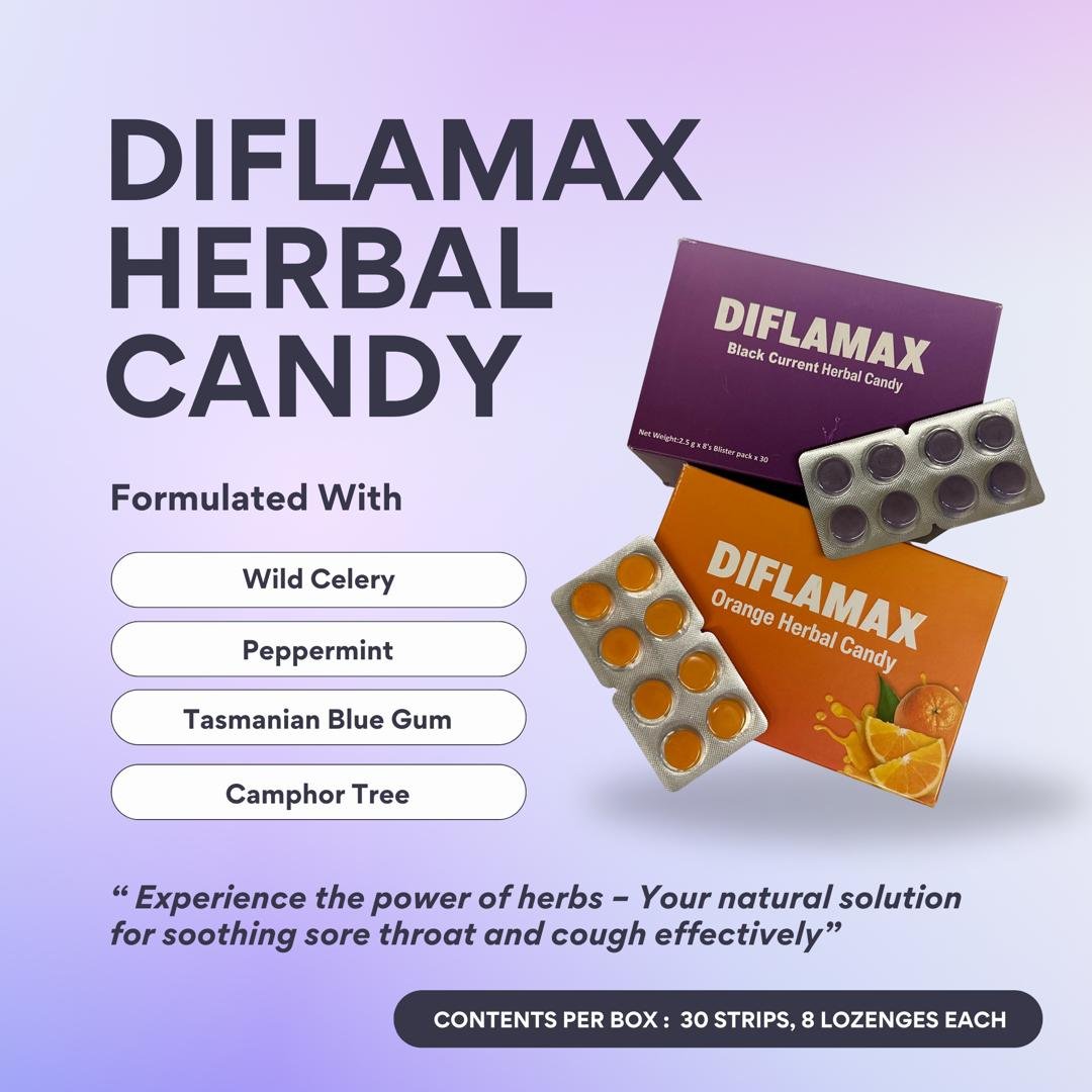 Give your throat the comfort it deserves with Diflamax Blackcurrant Herbal Candy, blending the bold taste of blackcurrant with natural herbs to soothe sore throat and ease cough. Each candy is packed with: